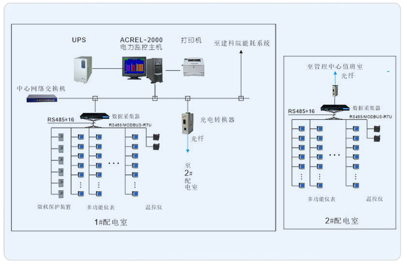 系統(tǒng)采用Acrel-2000型電力監(jiān)控系統(tǒng),監(jiān)控主機位于1#配電室內(nèi)電力監(jiān)控值班室,2#配電房距離值班室較遠(yuǎn),通過通訊管理機將采集的數(shù)據(jù)經(jīng)處理后經(jīng)光纖收發(fā)器和光纜上傳至位于1#配電室內(nèi)電力監(jiān)控值班室;所有配電回路均配備安科瑞電力儀表ACR系。該項目實現(xiàn)了13號地塊電力系統(tǒng)的智能管理。所有監(jiān)控設(shè)備均通過屏蔽雙絞線至各自配電室內(nèi)的通訊管理機,再通過光電轉(zhuǎn)換器經(jīng)過光纖將數(shù)據(jù)傳輸至1#配電室內(nèi)電力監(jiān)控值班室,從而實現(xiàn)遠(yuǎn)程監(jiān)控。