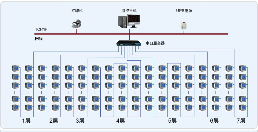 本項(xiàng)目電力監(jiān)控系統(tǒng)采用分布式結(jié)構(gòu),為現(xiàn)場(chǎng)層、通訊層和后臺(tái)監(jiān)控層。現(xiàn)場(chǎng)層指分布于于各樓層動(dòng)力箱及地下配電室內(nèi)的安科瑞系列儀表,通訊層包括NPORT5630-16串口服務(wù)器、網(wǎng)絡(luò)交換機(jī)等,后臺(tái)監(jiān)控層包括計(jì)算機(jī)、打印 機(jī)、UPS電源等。通訊層及后臺(tái)監(jiān)控層都位于地下監(jiān)控室內(nèi)。現(xiàn)場(chǎng)所有安科瑞系列儀表通過(guò)屏蔽雙絞線拉到地下監(jiān)控室內(nèi),與串口服務(wù)器相連,經(jīng)交換機(jī)與計(jì)算機(jī)連接,實(shí)現(xiàn)數(shù)據(jù)采集。