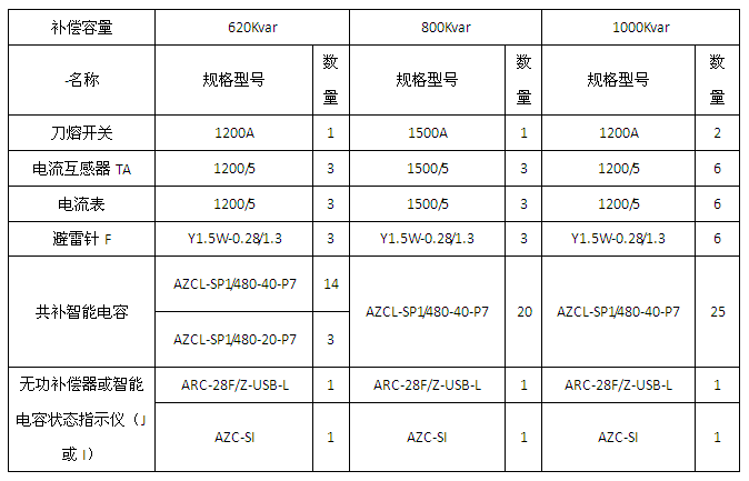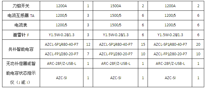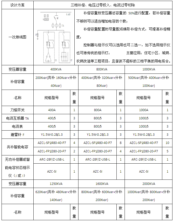 變壓器容量為400/800/1000/1250/1600/2000KVA的單相、三相混合補償應用方案(串接7%電抗器)