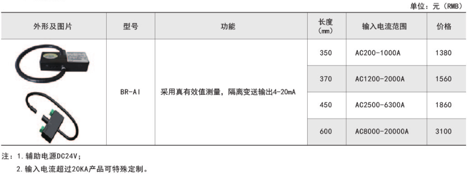 BR系列產(chǎn)品應(yīng)用電磁感應(yīng)原理,對電網(wǎng)中的交流大電流進(jìn)行實(shí)時測量,采用真有效值和線性補(bǔ)償技術(shù),將其隔離變換為標(biāo)準(zhǔn)的直流信號輸出。適用于冶金、電鍍、焊接等領(lǐng)域。具體型號:BR-AI技術(shù)要求:輸入電流AC1...